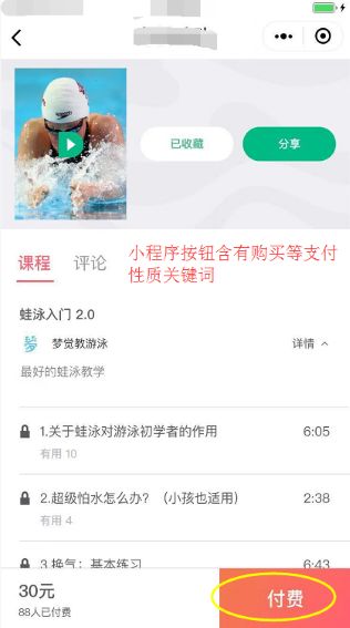 5、关闭iOS端虚拟支付功能后,小程序中虚拟产品页面不可以含有付费性质的关键字(如:购买、已购、付费、支付等),包括但不限于功能按钮、功能页面、支付提示及任何商品介绍等。详情如下: