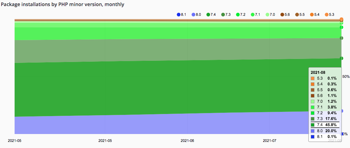 另外,可以查看packagist statistics的PHP的版本分布情况,从2021年5月至8月,7.2从11.1%降到9.4%;8.0从15.0%升至20.0%;建议有条件的开发者/商户选用PHP8来对接微信支付。