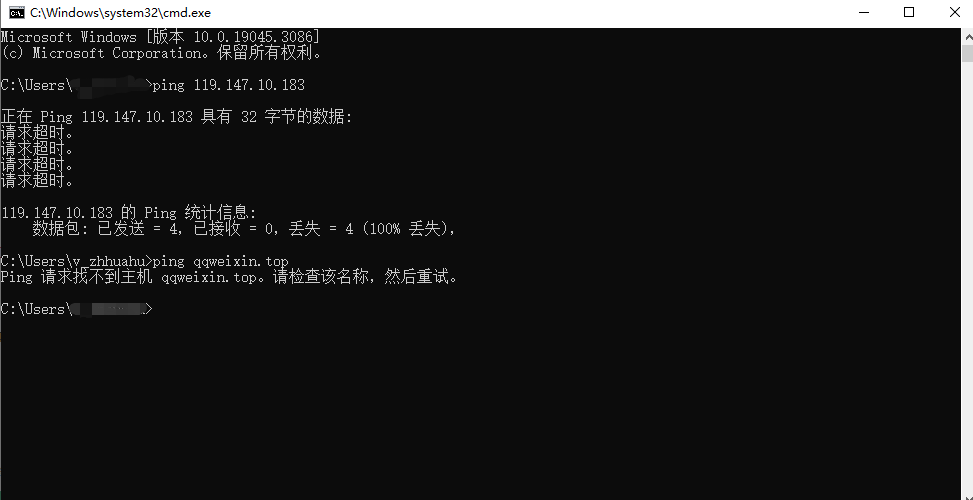 检查ip地址/域名是否可以ping通:如何ping域名,建议是在不同网络下进行操作,这样可以检查是否是内网ip,ping不通可能的原因是ip地址和域名没有映射成功或者是内网ip(同网络能ping通,不同网络不能ping通,一般就是内网ip),需要到注册的域名网站重新进行映射