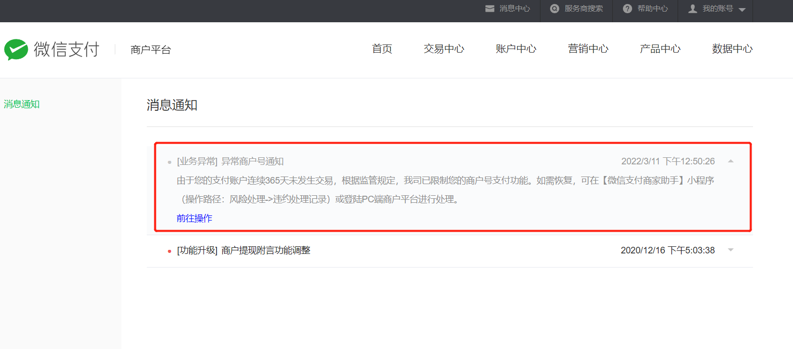 查看了消息中心 提示365天没有交易 需要点击链接恢复