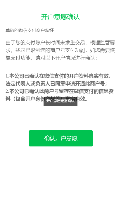 由于商户号长时间无任何交易行为,所以微信支付根据支付服务协议3.7条内容暂停了商户的相关权限,若仍需继续使用商户号,请按以下方法操作申请恢复使用,若未收到相关通知,请联系客服反馈申请恢复(拨打95017或微信搜索「腾讯客服」)。