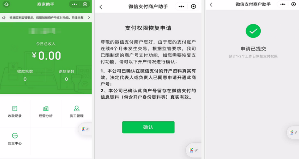 打开之后,显示已恢复,但是去支付的时候为什么还是弹出 “此商家的收款功能已被限制,暂无法支付”。