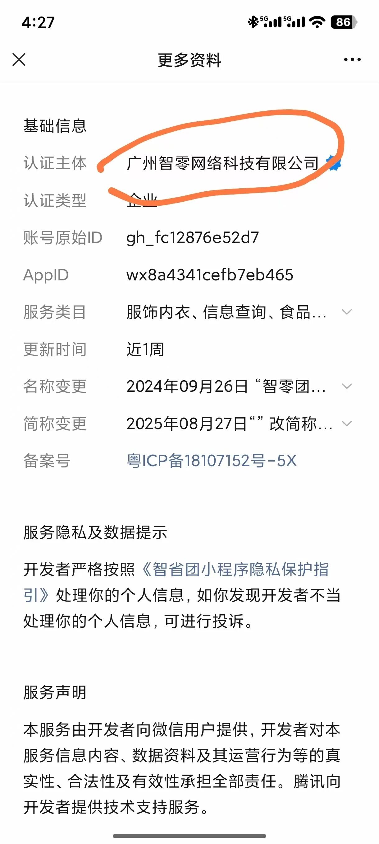 看下小程序的主体信息,是不是和填写的一摸一样,可以复制小程序上的。