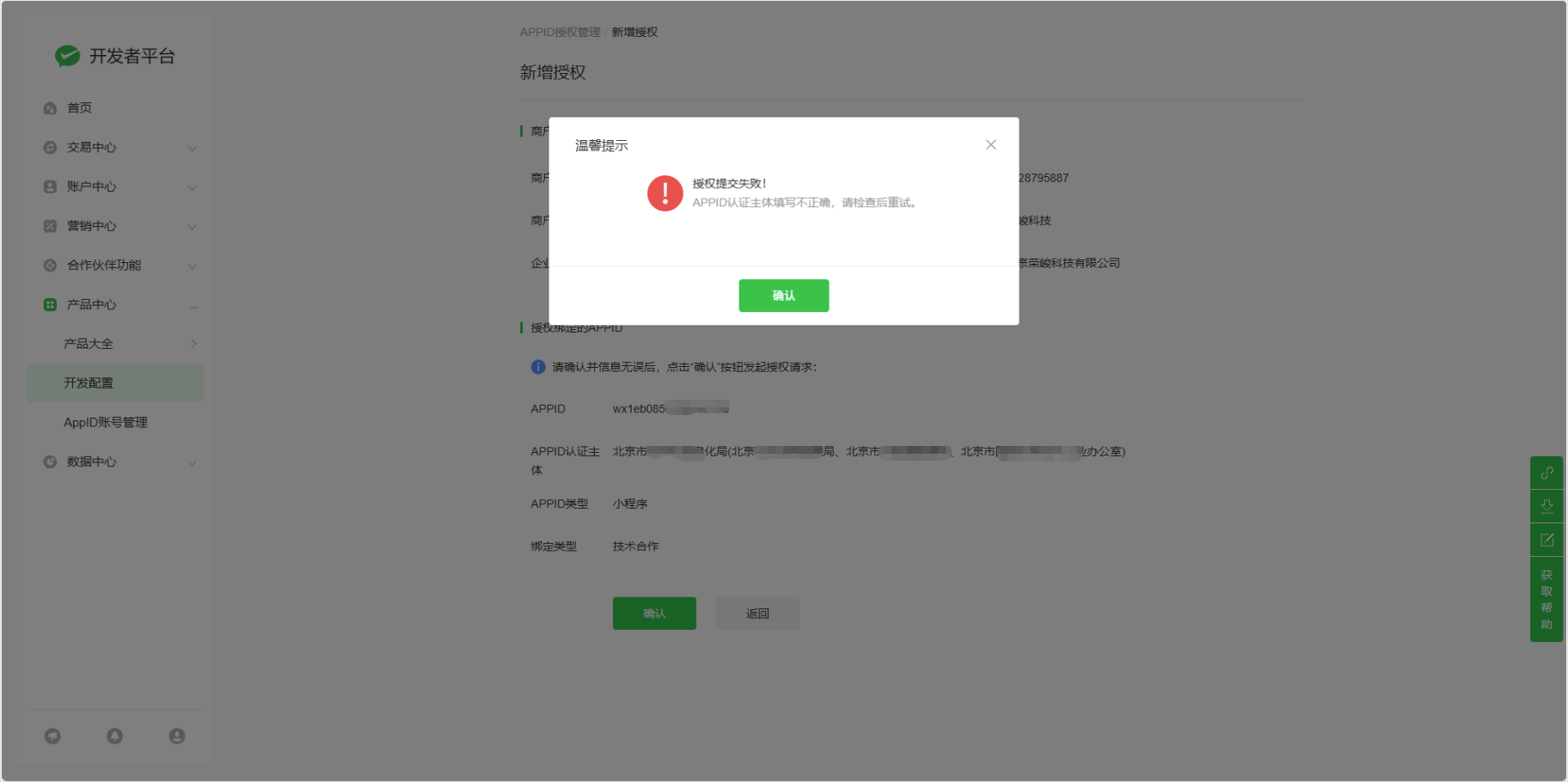 现在有个问题,相同的小程序appid,在商户后台直接授权appid能正常授权,但在服务商后台帮助特约商户授权时一直报“APPID认证主体填写不正确,请检查后重试。”