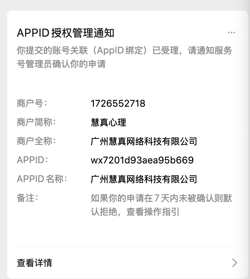 我昨天申请开通新的微信商户号,填写了已认证服务号的APPID,今天微信商户号开通成功,但收到需要服务号确认授权APPID的通知。我去服务号却怎么也找不到需要确认的信息,该怎么办?