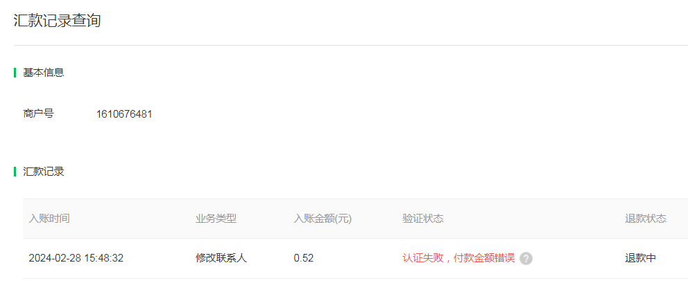 个体户申请的商户号 让用3310的卡打款验证 金额也是要求的金额 现在钱退回来了 显示打款金额错误 但是确实是按要求打款的
