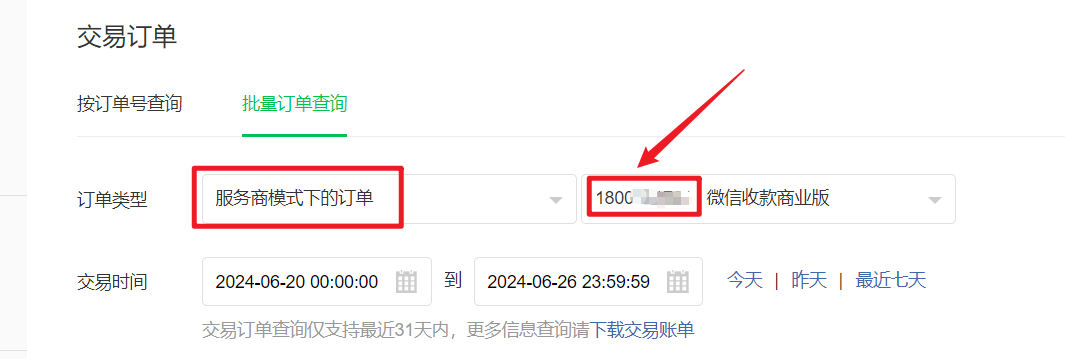 如果请求参数使用 服务商模式下的订单显示的商户号(如图箭头所示),则返回值为“<return_msg><![CDATA[签名错误,请检查后再试]]></return_msg>”;