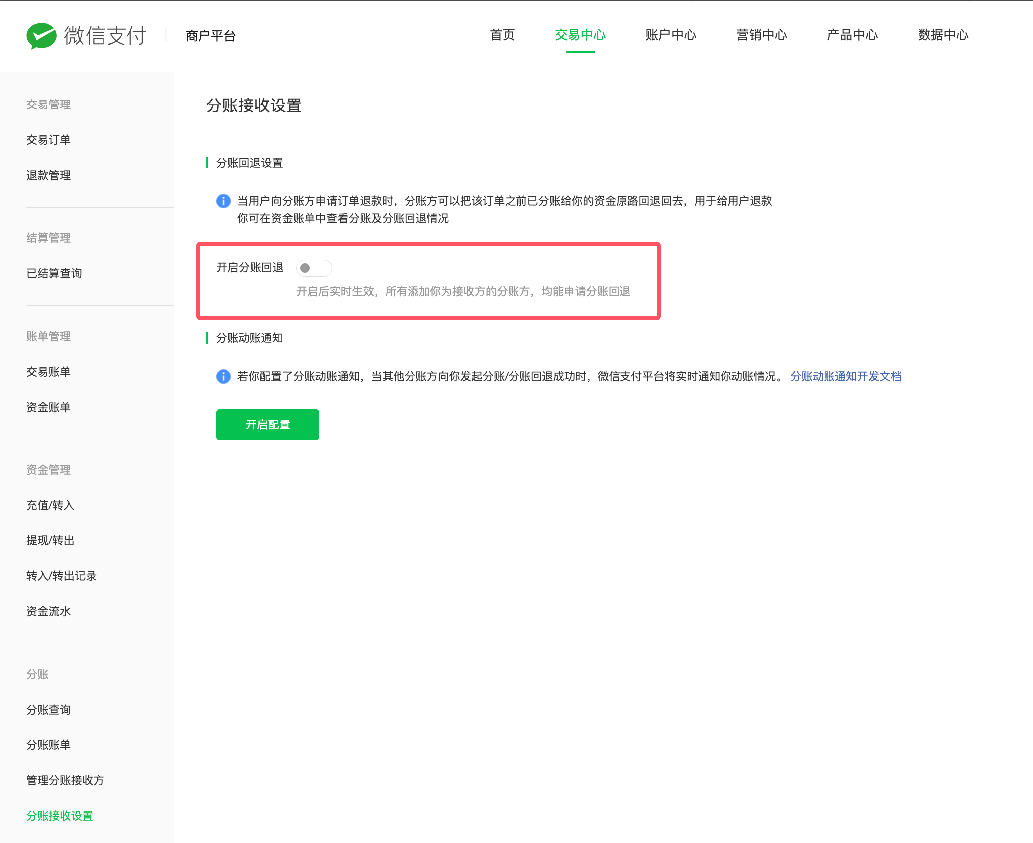 从哪个商户号回退就给哪个商户号开通回退功能,开通在商户后台->交易中心->分账接收设置->开启分账回退