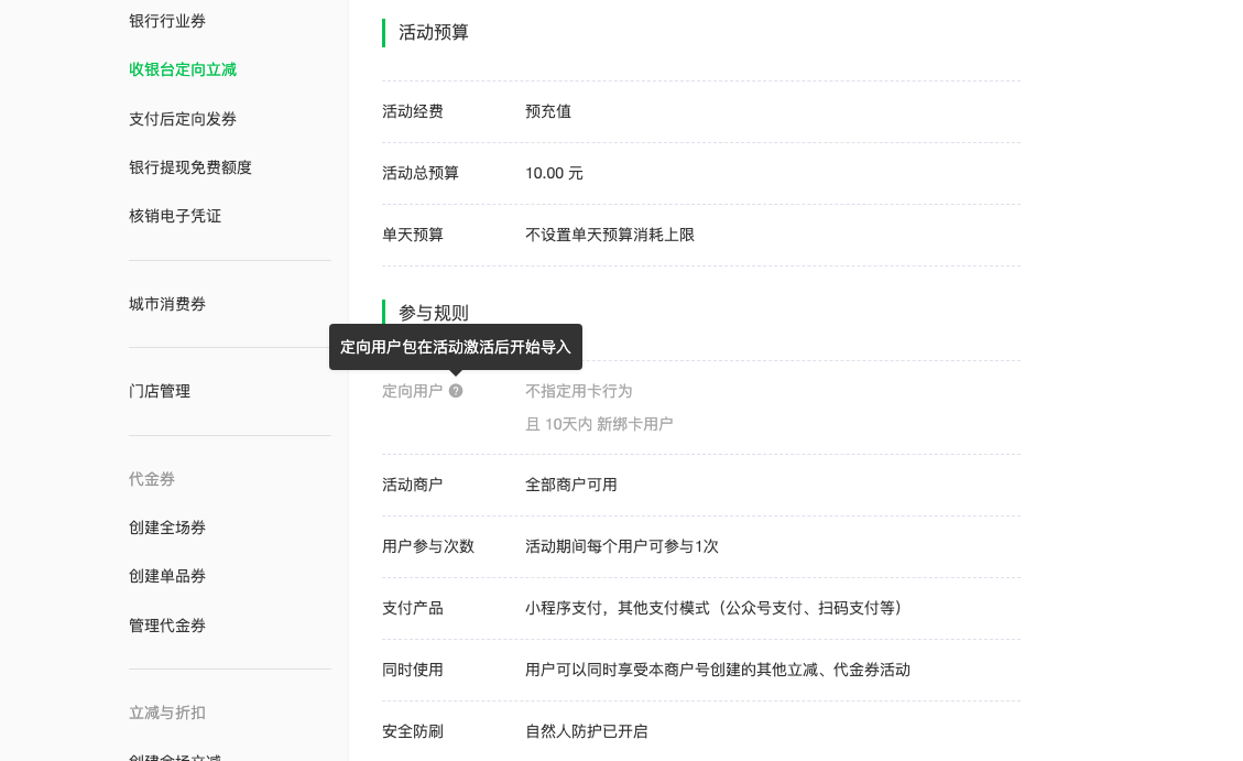 是不是接口还不支持定向立减类型啊,接口文档没有相应的报错