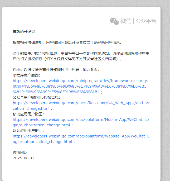 当收到用户撤回授权通知时,需立即停止使用该用户的授权数据,并更新商户系统中的授权状态。若未及时处理,可能导致后续接口调用失败(如返回40003错误码),或因使用无效令牌引发安全风险。