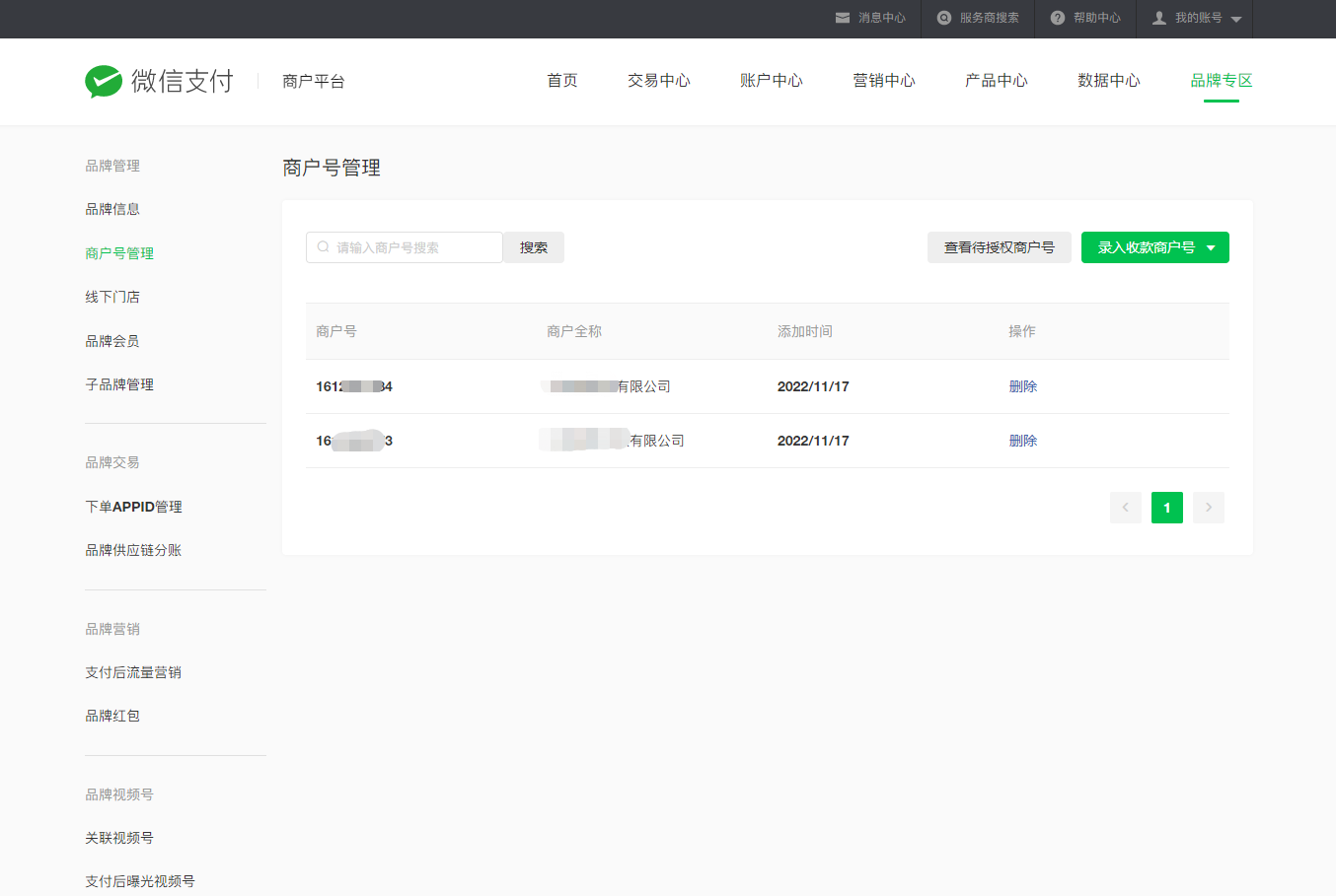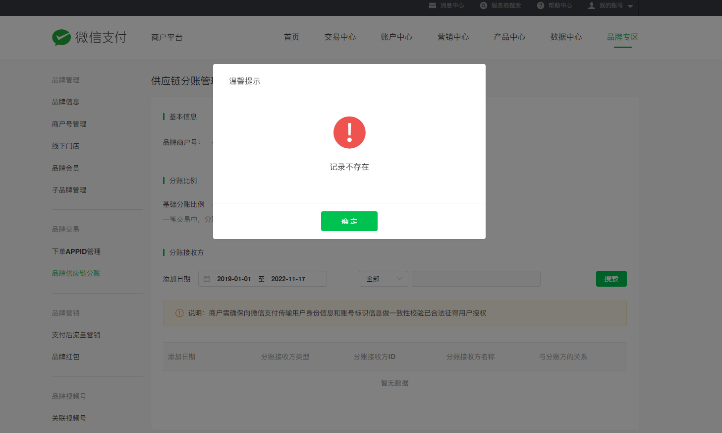 品牌是特约商户自行申请的,申请成功之后,服务商邀请品牌入驻,之后又补交了品牌主体关系信息的证明资料,上传了特许经营协议。昨天下午审核通过,邀请了另外两个主体的特约商户成为品牌的门店和收款商户。接下来去设置品牌供应链分账就遇到了“记录不存在”这个问题。