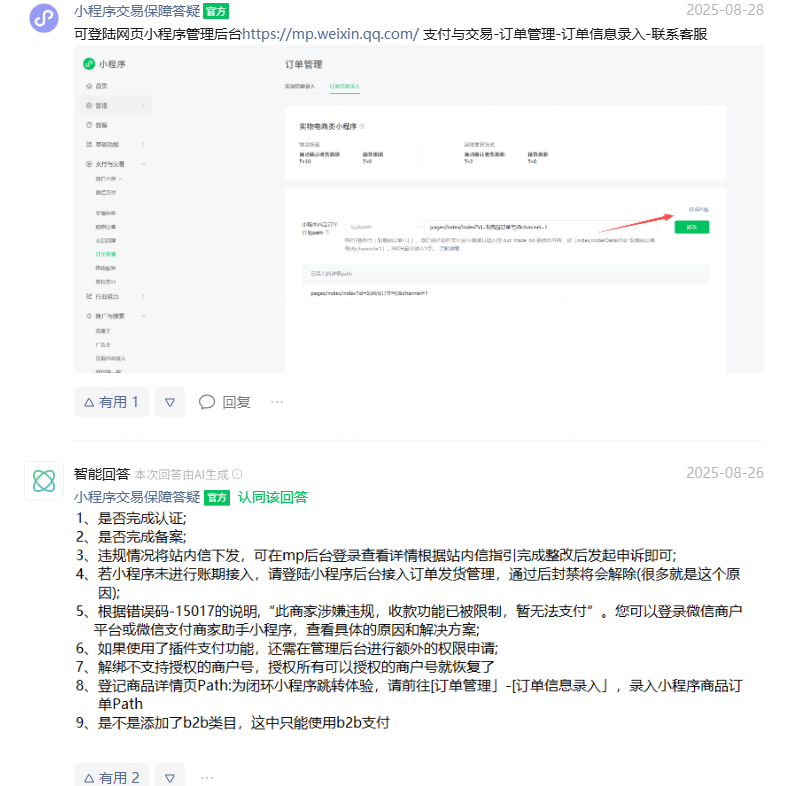 3.查询了问题,提示说是订单路径没设置好的事??这个问题定位到是小程序前端开发的问题还是哪里配置没对,求大佬解答