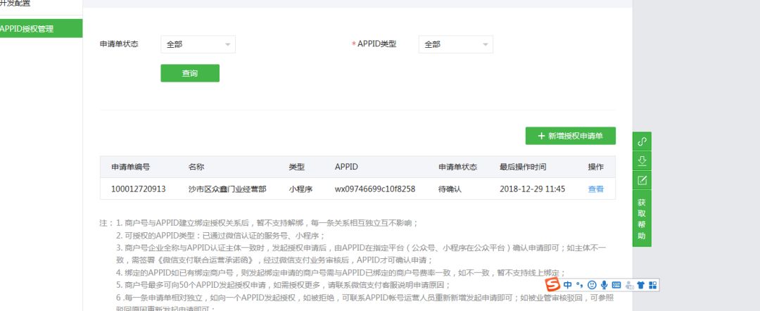 我已经绑定我公众服务号小程序APPID,发出申请微信支付信息,需要到公众服务号MA申请授权确认。但是到公众号,MA申请无显示,无法确认。但是微信支付信息还是显示,去服务号确认授权(待确认)。你知道是啥问题呀。那个大神,帮忙解释下。