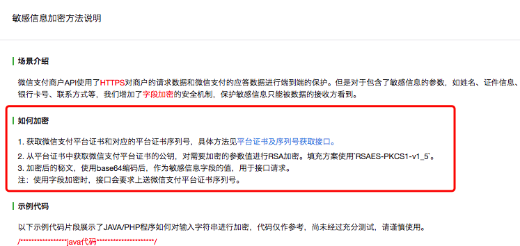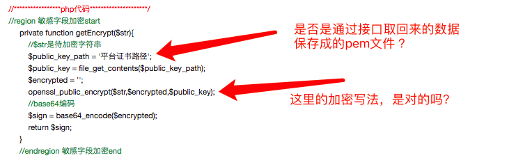 <?php private function getEncrypt($str){ //$str是待加密字符串 $public_key_path = '平台证书路径'; $public_key = file_get_contents($public_key_path); $encrypted = ''; openssl_public_encrypt($str,$encrypted,$public_key); //base64编码 $sign = base64_encode($encrypted); return $sign; }PHP官方函数文档: https://www.php.net/manual/zh/function.openssl-public-encrypt.php ,上述封装声明的padding模式即取的默认值:OPENSSL_PKCS1_PADDING ,等于文档上写的 RSAES-PKCS1-v1_5;如果一直报解密失败,可以尝试把这个padding换成APIv3的 OPENSSL_PKCS1_OAEP_PADDING 试试看,代码即: