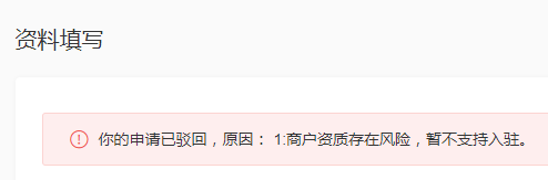 特约商户申请,审核被驳回,原因是【商户资质存在风险,暂不支持入驻】。