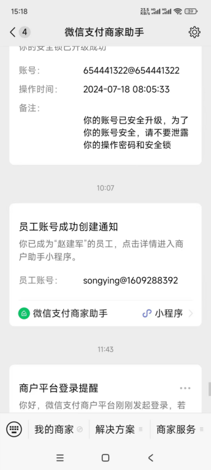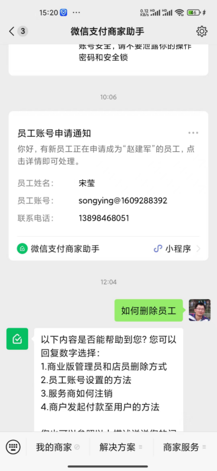 【财付通】微信支付客服 尊敬的商户,您好! 关于您反馈的问题,经核实,请您核对登录商户号是否有误,尝试登录微信支付商家助手-安全中心-风险监控-添加安全联系人,选择需要删除的员工,按住向左滑动,即可看到删除入口,感谢您的理解与支持! 祝:生活愉快,工作顺利