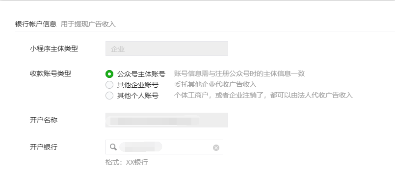 因为这个游戏绑定的公众号和迁移后主体一致,所以修改流量主收款时,收款账号类型选择了公众号主体账户。