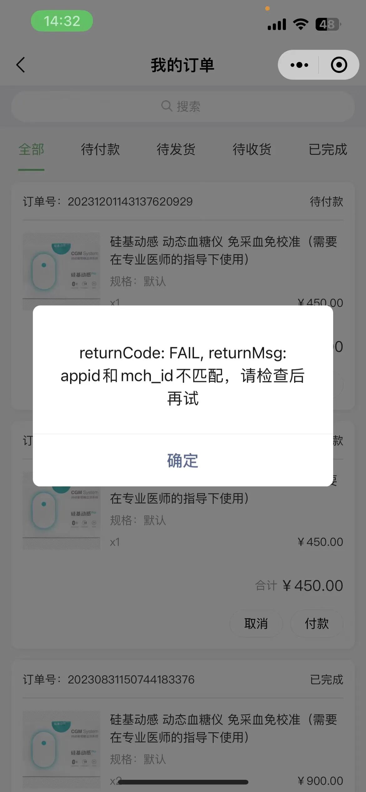 1,appid或mch_id填写错误,请确认appid和mch_id是否正确