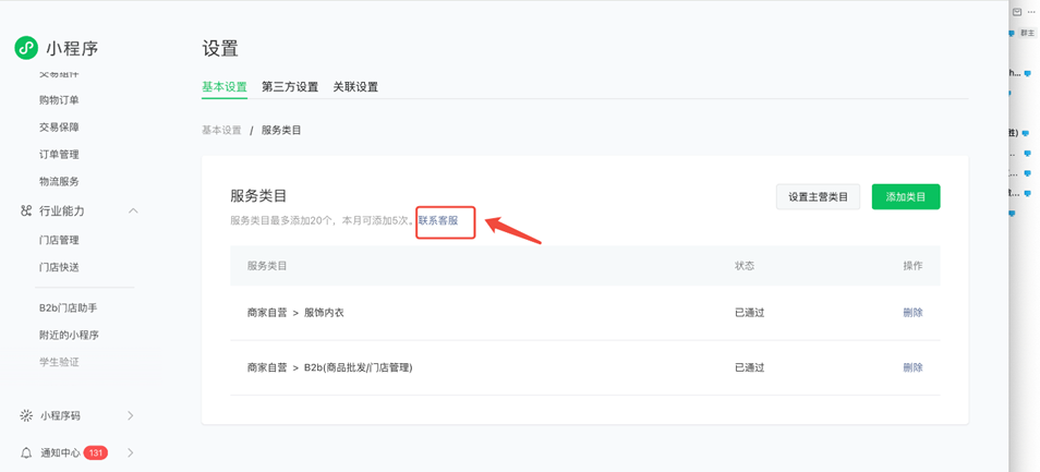 小程序此前添加B2b类目无对接B2b商户号,会被限制除B2b外的支付功能。删除类目无效,可以联系小程序类目客服处理