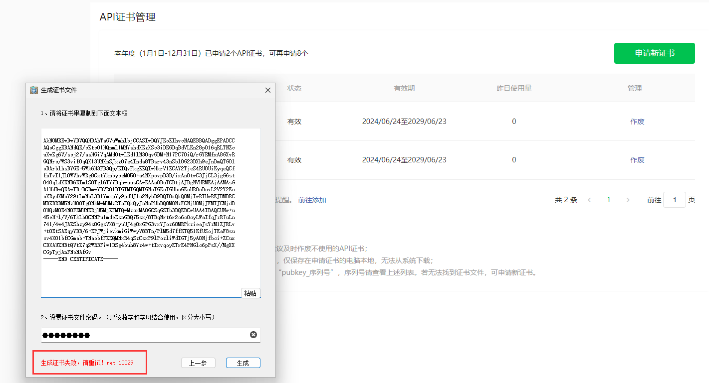 API证书已成功生成了,但提示私钥文件生成失败。又没地方下载私钥文件,怎么办?