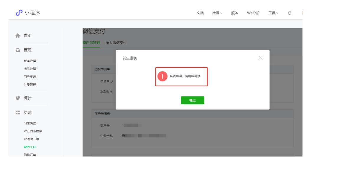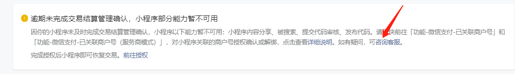 逾期未完成交易结算管理确认,小程序部分能力暂不可用 ,小程序内容分享、被搜索、提交代码审核、发布代码、功能暂且不能使用了。目前我这边对小程序关联的商户号授权确认或者解绑以后 还是不行 小程序依旧不能分享(另外我解绑以后就绑定不上去商户号了 一直提示系统措误 请稍后再试 操作好几次都不行,换了浏览器也不可以)请问这个是什么原因呢、官方客服也是没有给出答案来。