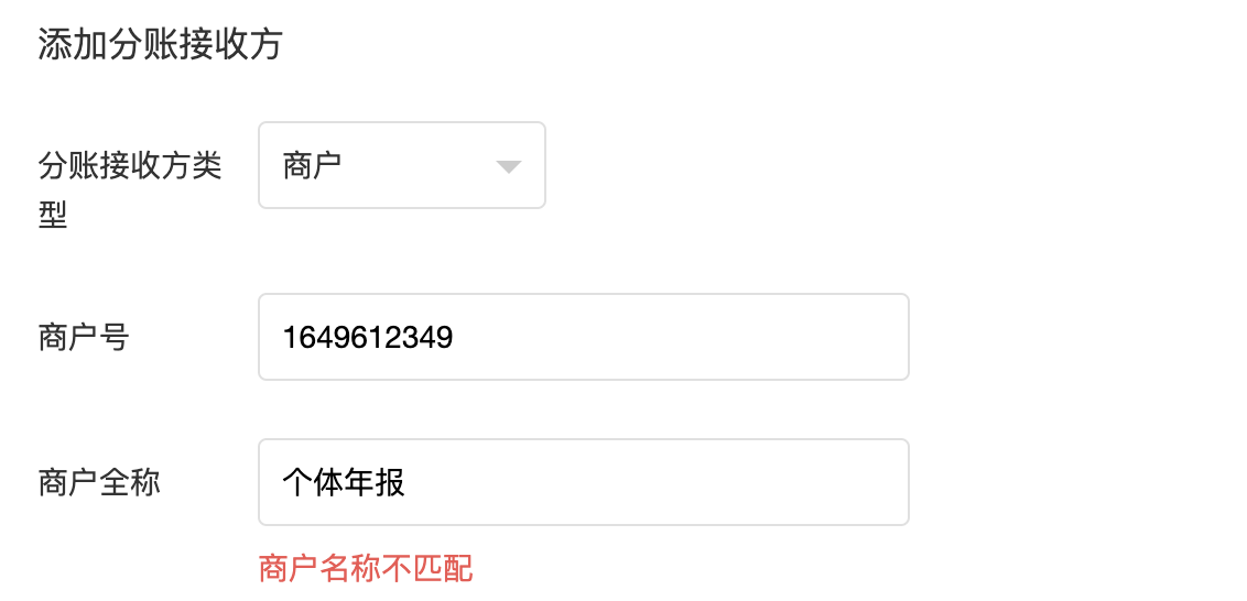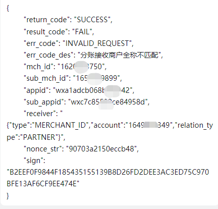 我是服务商(账号:1620603750),申请了2个子商户,老板的需求是,子商户A(账号:1649612349)分账给子商户2(账号:1651939899)。一直提示:分账接收商户全称不匹配。这个和服务商 是不是没关系?