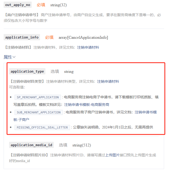 接口的字段说明不是很清楚?选择 SUB_MERCHANT_APPLICATION,你还是需要传 application_media_id 参数(把对应模版内容拍照后,通过上传图片接口返回的 media_id赋值)