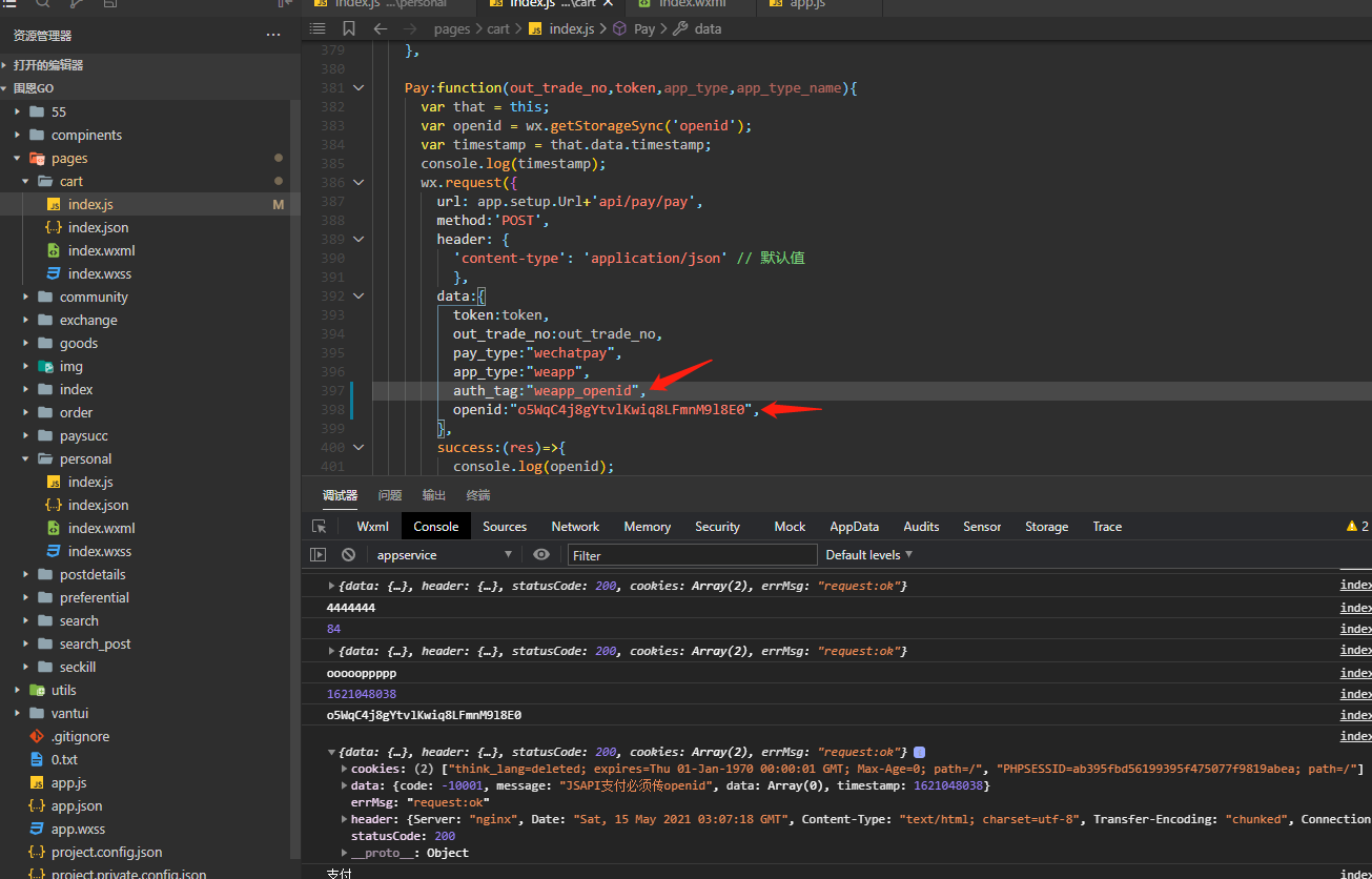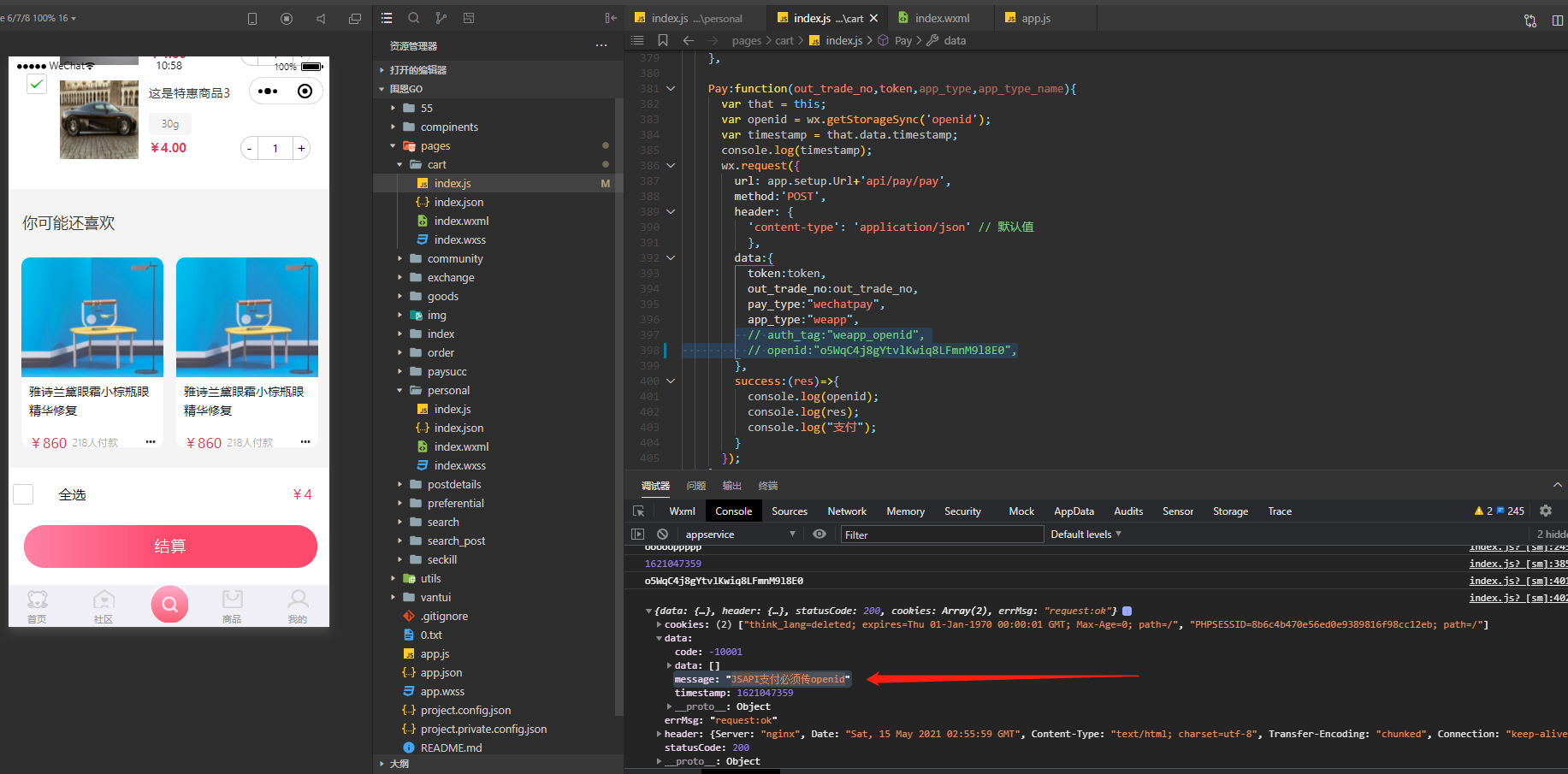 图一为支付接口的文档,当我按照文档去进行调用的时候,工具报错提示 “JSAPI支付必须传openid”,图二为调用接口后的返回信息,图三为支付方式的接口,这里我用的是 wechatpay, 现在求各路大神路过拔刀相助,万分感谢。
