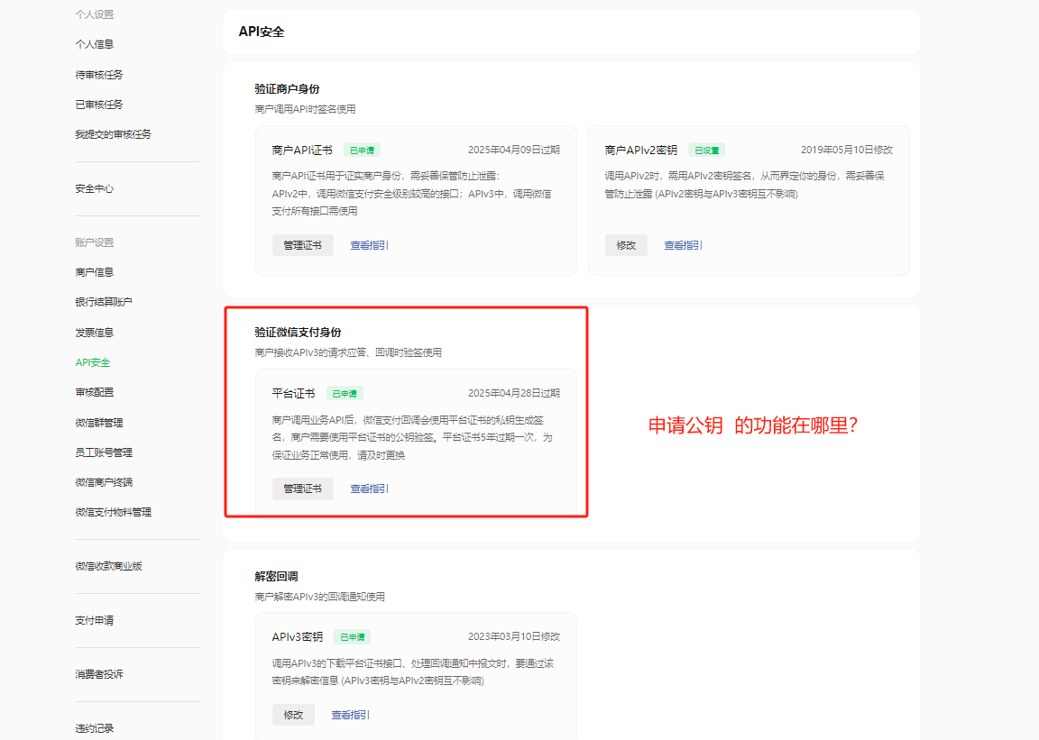请问申请公钥的功能在哪里?而文档里是有这个功能的。https://pay.weixin.qq.com/doc/v3/merchant/4012154180