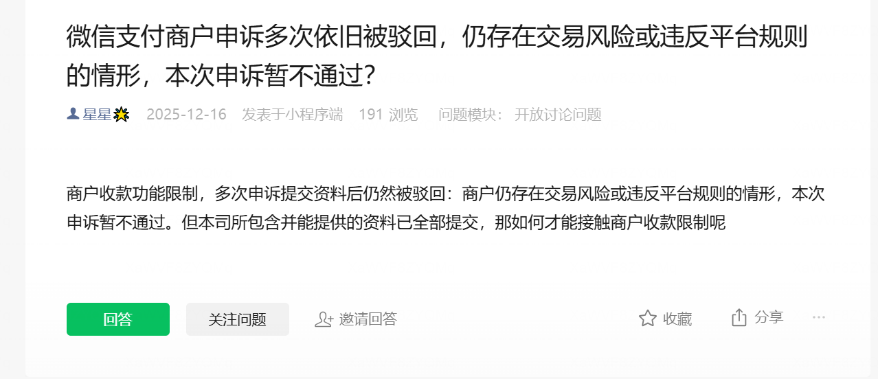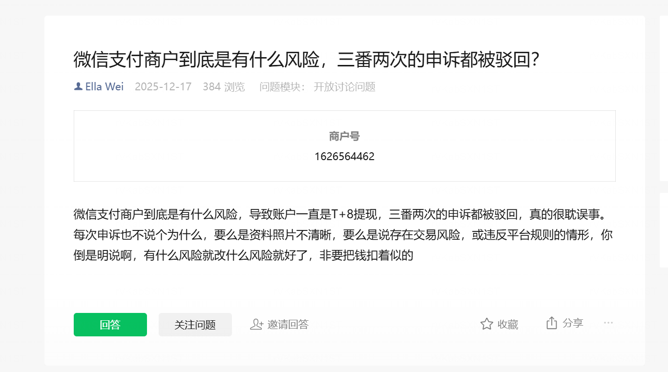 平台和商户之间应该是平等的,商户遇到问题平台需要协助解决,而非用客服官方话术一次又一次的搪塞商户。平台设置风控的出发点应该是让用户享受到更加安全的支付环境,而非给守法经营的商户设置诸多障碍。我看到近期有很多和我们遇到同样问题的客户在提问,这样的商户不在少数,希望平台能够重视商户们的建议和反馈,打造一个更和谐的使用环境,谢谢!