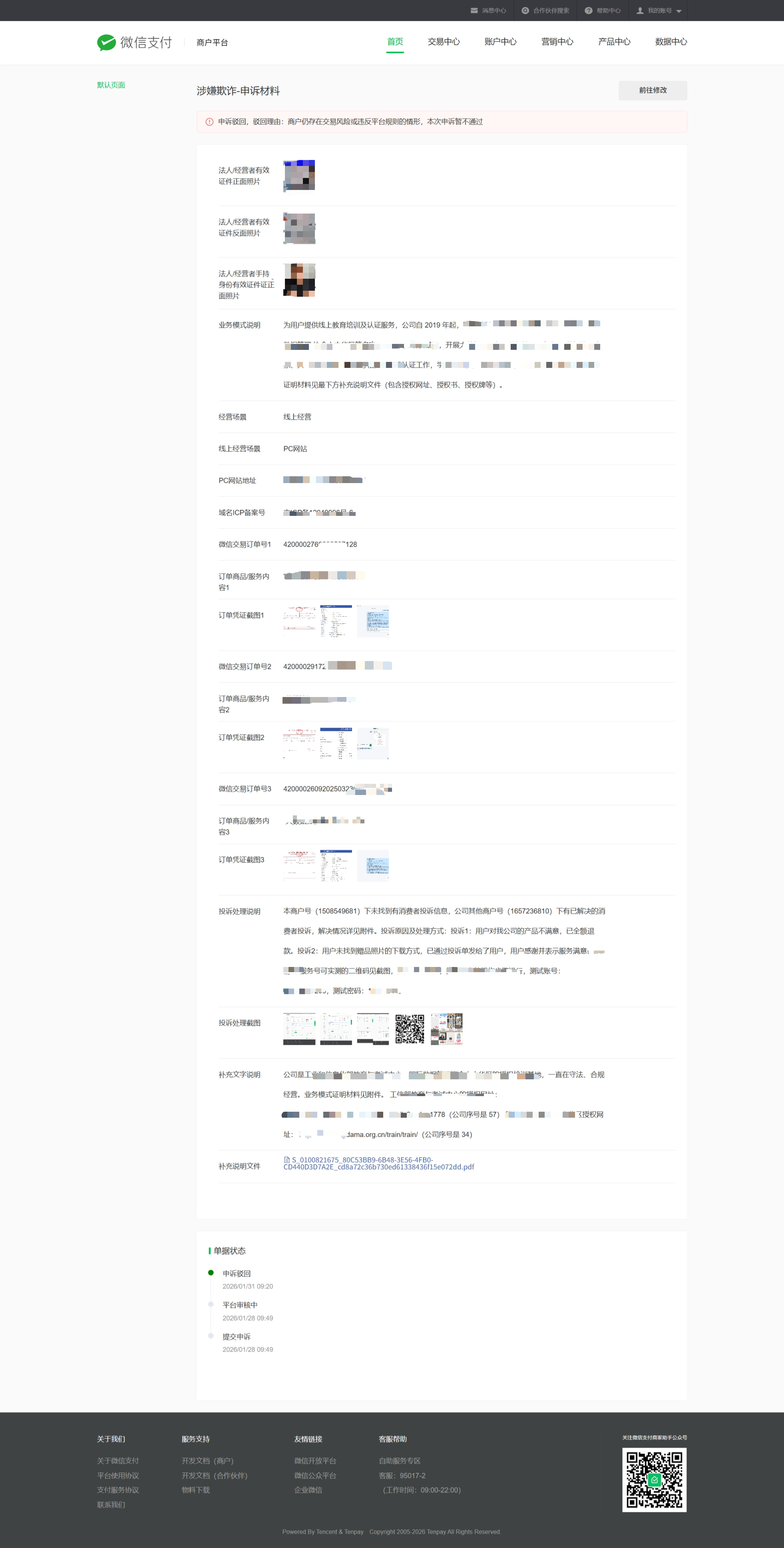 和客服沟通后,我们对申诉进行了修改,提交的资料包含了详细文字描述真实经营业务及相应证明材料;小程序可实测的二维码以及对应的测试账号和密码;以及交易订单号(420开头28位数字)及相对应的售卖商品凭证或提供服务凭证(包括发票、交易聊天记录截图、订单截图)等信息。提交要求的所有资料后,仍被驳回了2次。驳回理由仍是:商户仍存在交易风险或违反平台规则的情形,本次申诉暂不通过。每次驳回也并未告知该如何修改材料,或者需要额外补充哪些材料。