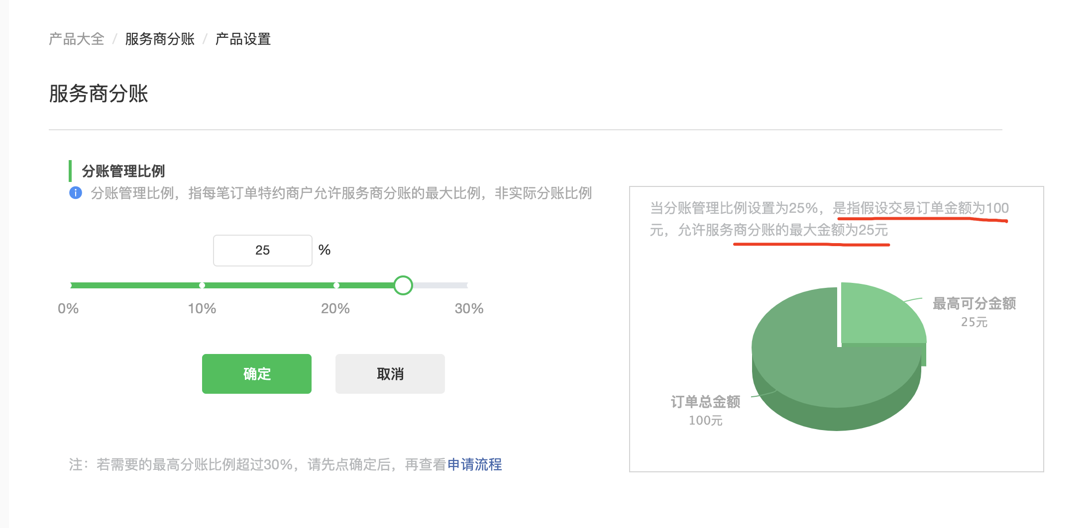 按第一个描述,比如分账比例25%,100元的订单最多可以分25元