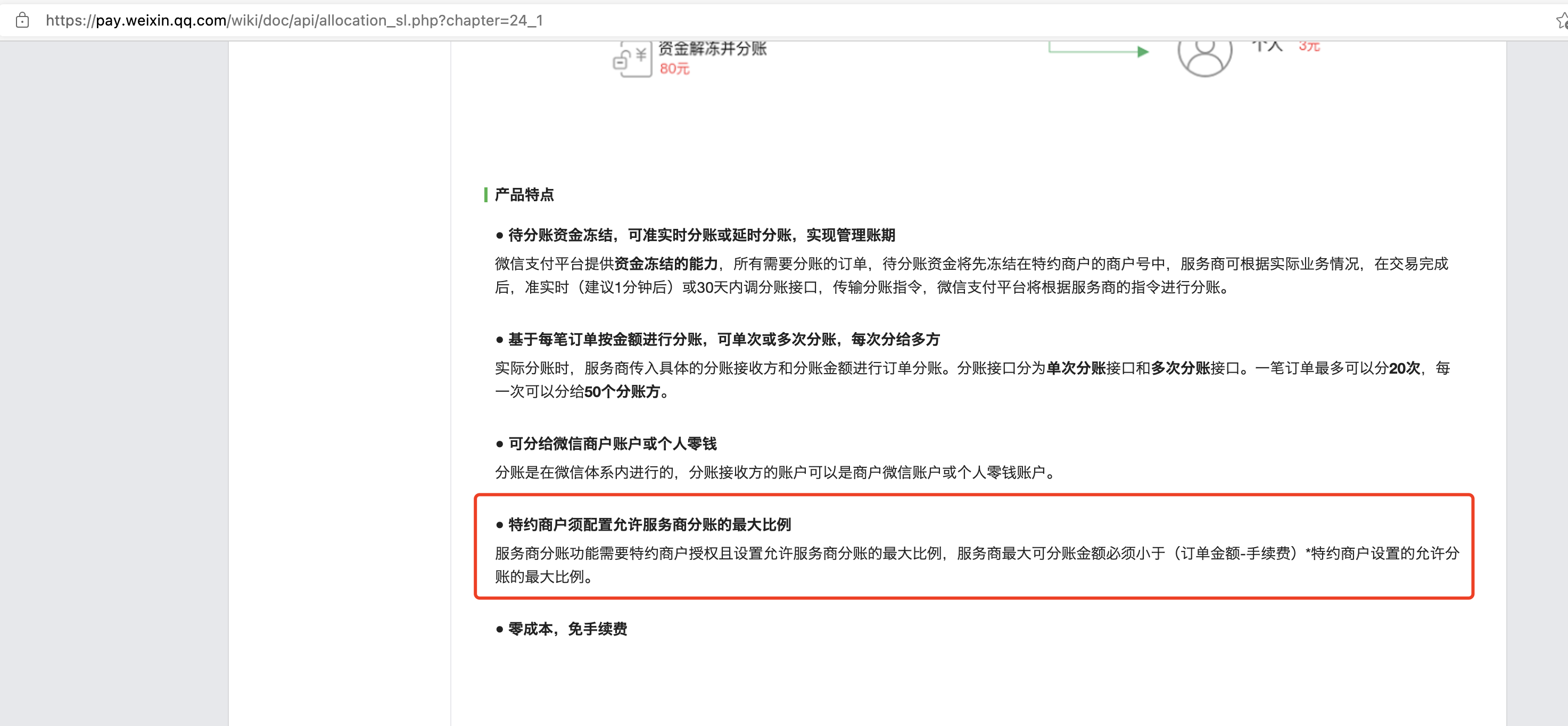 这里描述并无不当,对于开通了收支分离功能、0费率商户、收付通平台承担手续费的二级商户,他们的最大可分账比例就是订单金额*最大分账比例;在服务商下也不是所有商户都属于0.6%的费率,严谨情况下应是根据实际订单待分账金额进行分账计算,系统是有提供查询订单待分账金额接口。