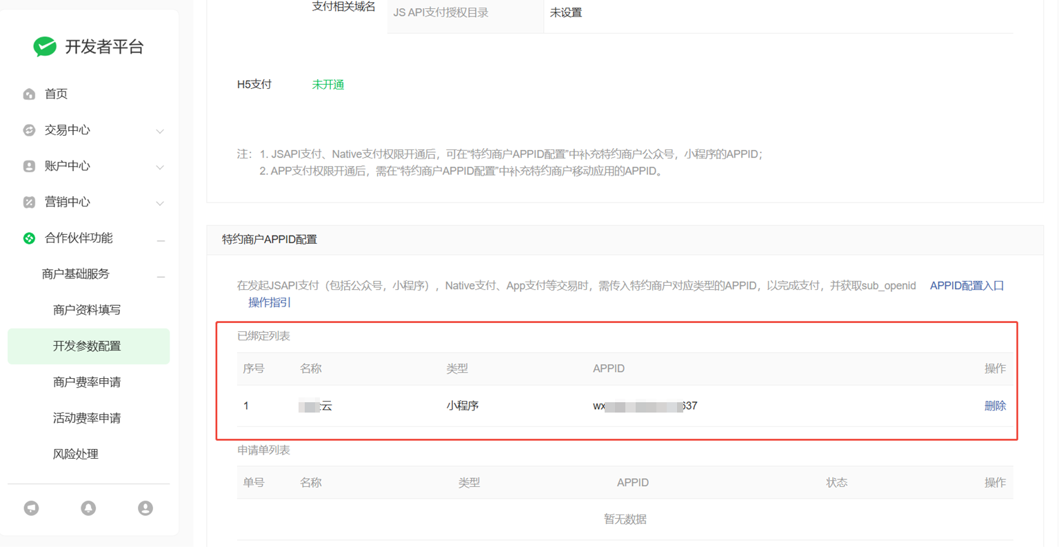 但是小程序后台 已关联商户和待关联商户(服务商模式下)都没有已关联商户,导致小程序拉取支付的时候 一直提示 缺失 prepay_id