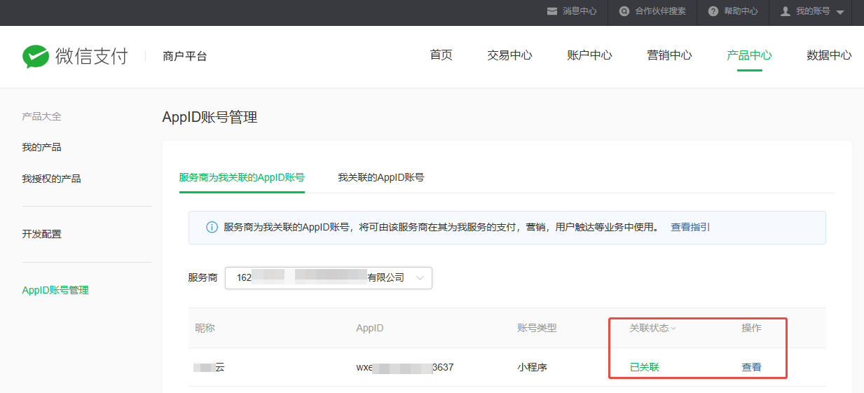 客户的商户后台也显示 和小程序已关联绑定(服务商为我关联的appid账号)