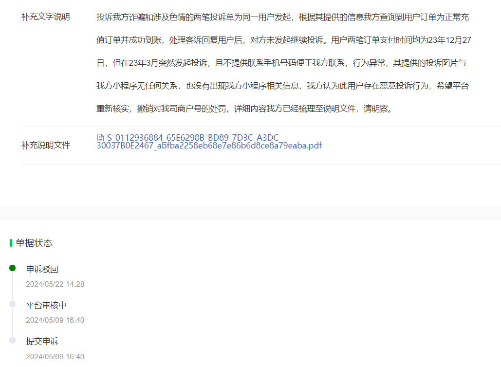 我们的微信支付商户被判定涉嫌色情,关闭了收款能力,排查后发现是有个用户通过消费者投诉上传了一张和我们公司完全没有关系的色情图片,说我们在做色情业务,这用户是通过去年的订单发起的投诉,没留联系方式完全联系不上。