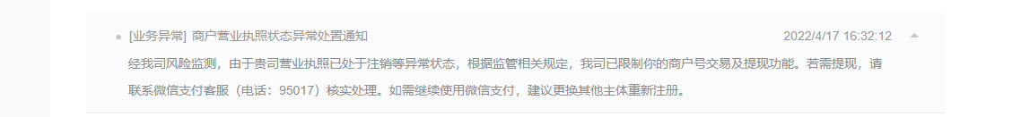 为啥我的营业执照好好的,确发消息来说说吊销了,把支付功能关掉了