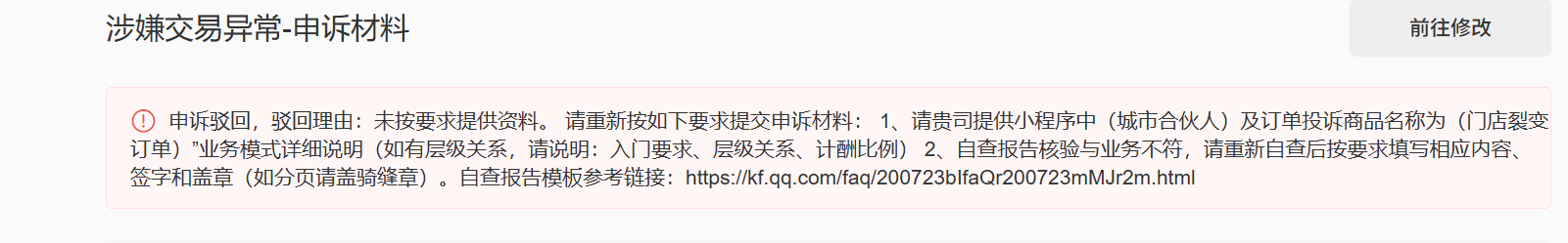 商户号:1666626716,本商户不涉及多级分销业务模式,已按要求提供了详细的业务模式说明和自查报告,但是仍多次被以“未按要求提供材料”为由驳回