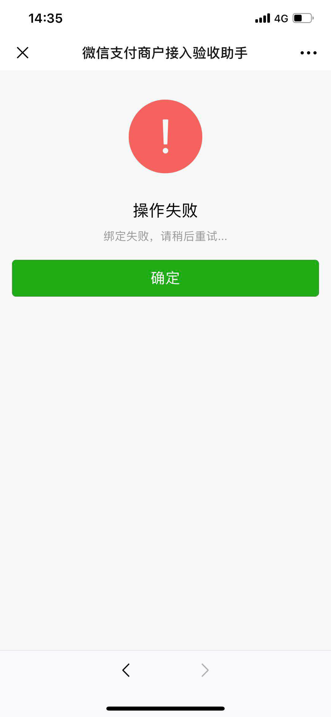 我从微信支付商户接入验收助手的子菜单,我的验收:查询验收结果,进行绑定微信支付商户接入验收时,一直提示绑定失败,请重试。已经重试多次,且取关再试也不行。