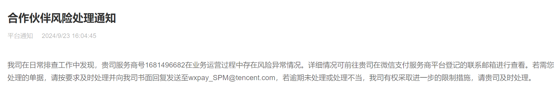 啥都没干,新申请的服务商账号,才开始进件2个进行开发调试,直接来了一个这个风险提示,如果是商户资料有问题的,那请不要给他进件的,给商户进件了,然后又给商户关闭了,要商户进行申诉,什么业务都没开展的,就开始申诉,说是风险。服务商是啥的都没干 ,就是测试接口的的时候1块2块的在测试接口。发的这个通知说有邮件,也没有找到邮件在哪的,根本无法进行任何操作 不知道哪里有问题的。已经被微信支付折腾的好久了 一会一个问题的现在创业公司太难了,麻烦微信支付官方人员看下这个具体是因为什么原因造成的 也打了客服电话的,很难打通,打通了也是让等邮件