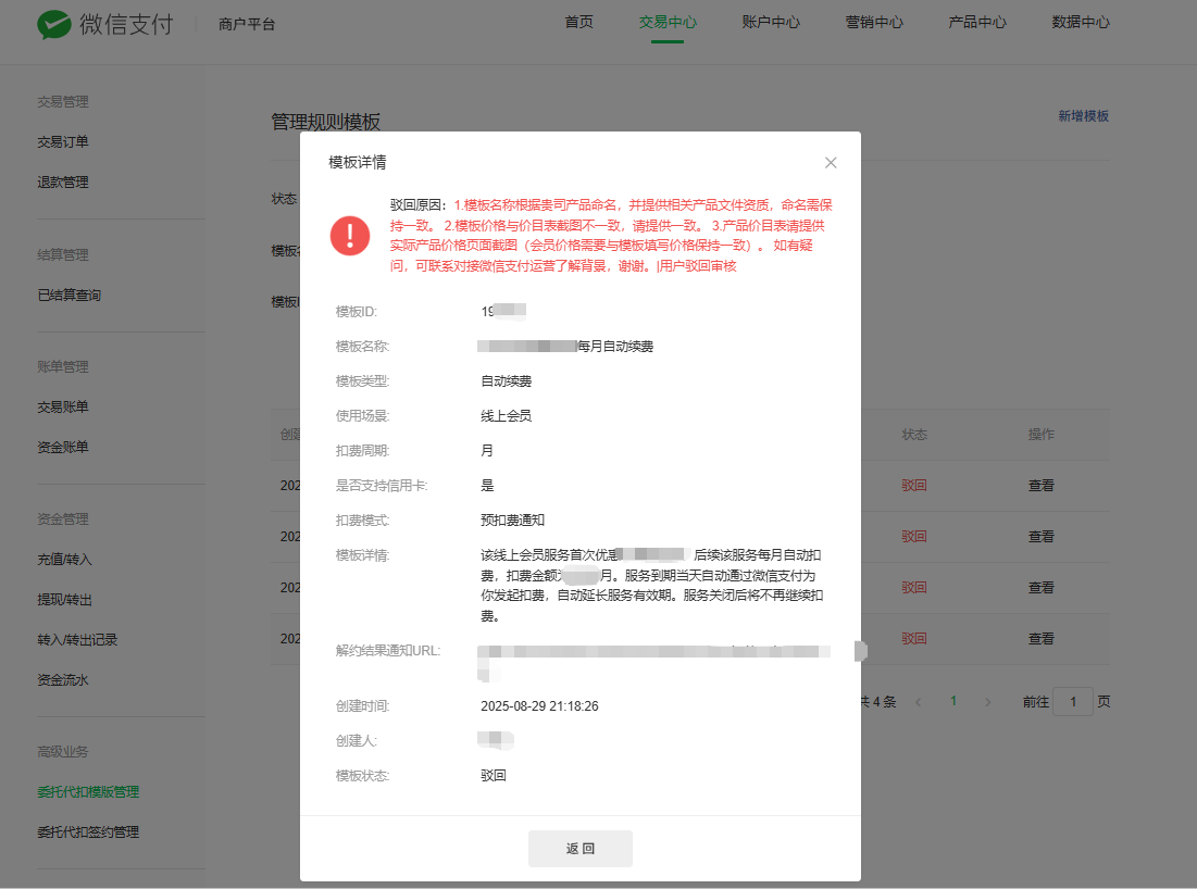 委托代扣模版管理被拒4次了,有没有参考文档啊?付费求,代申请也可以