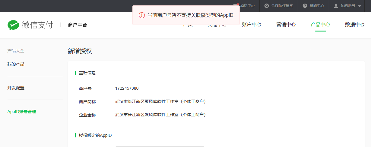 第二次说要公众号的AppID,好,我又花了300块,这次依然提示当前商户号暂不支持关联该类型的AppID。说什么公众号必须是服务号,不是订阅号。哈哈哈哈哈哈!注册的时候,你有地方选择是服务号还是订阅号???