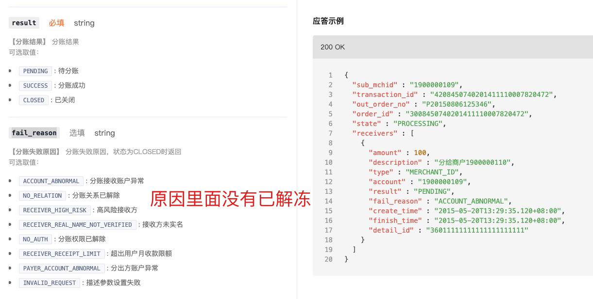 你好,请问分账 “查询分账结果API”,如果订单是超过30天自动解冻的,那返回值是什么样的,state和receivers[].result和receivers[].fail_reason分别是什么
