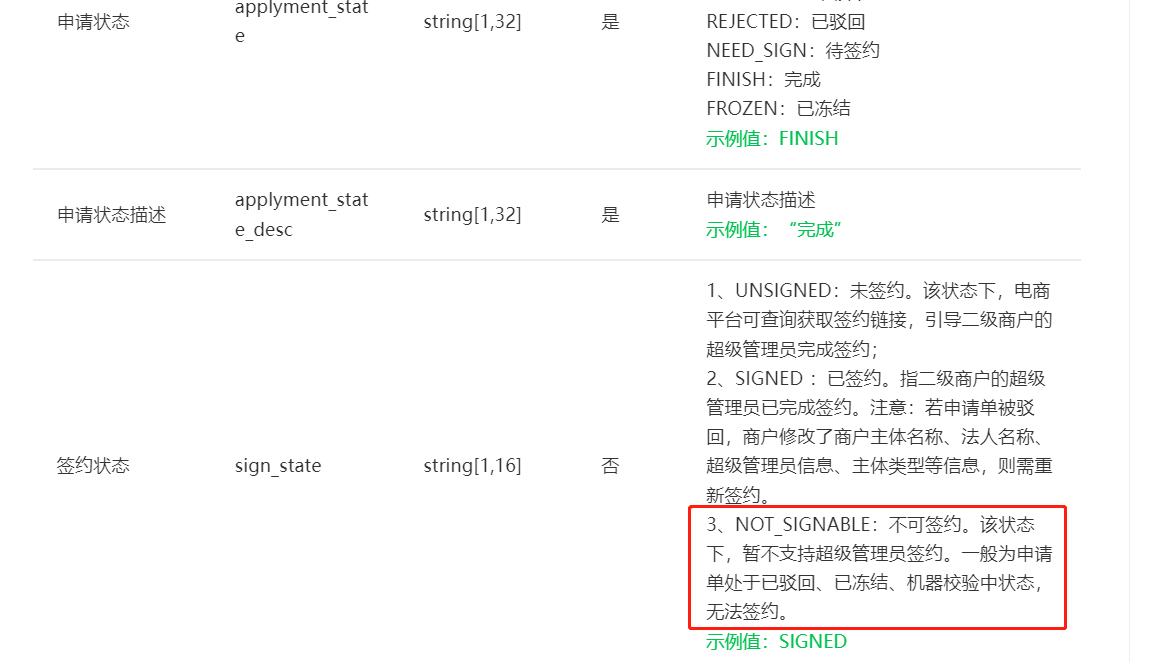 2.签约状态为不可签约的原因没有很明确,申请状态不符合文档上写的一般处于的已驳回/已冻结等状态。目前猜测是有待签约状态的过期规则,但文档上没体现。