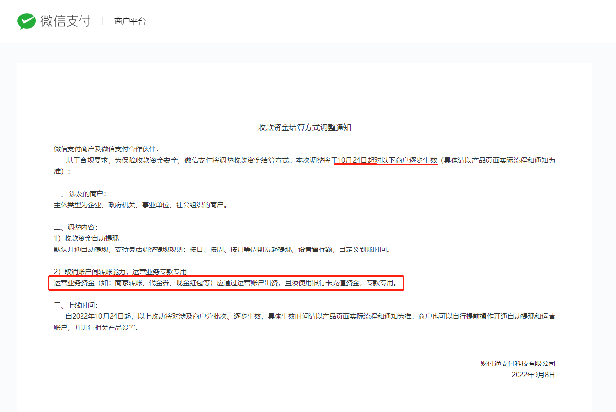 收款资金结算方式调整通知:https://pay.weixin.qq.com/index.php/public/cms/content_detail?platformType=0&lang=zh&id=126521