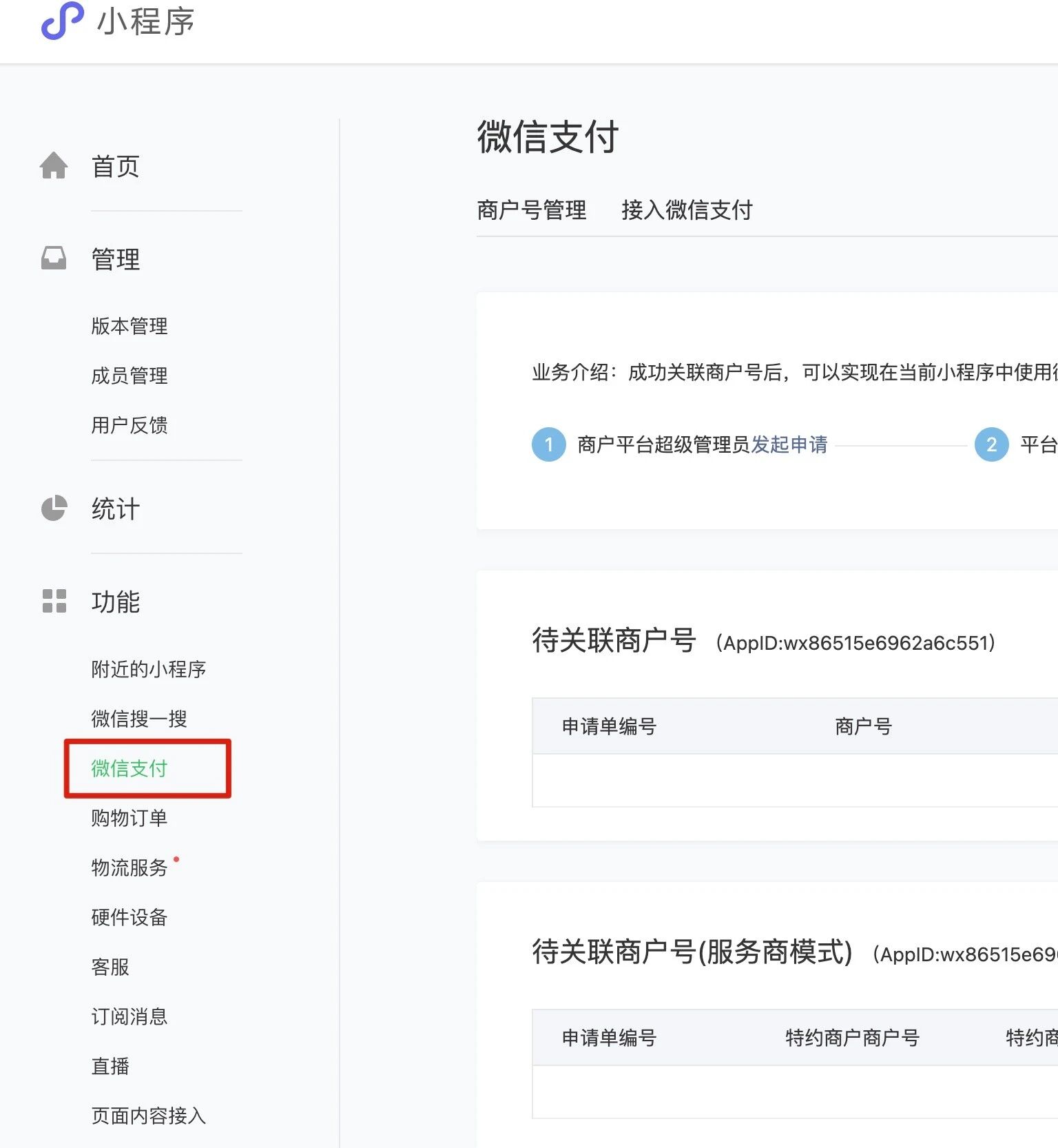 普通小程序的话目前分为微信支付和支付管理2种模式(正常途径不支持切换,以后台为准)和微信支付商户号绑定的。如果是微信支付的话可以绑定多个微信支付商户号,如果是支付管理则只能绑定一个。