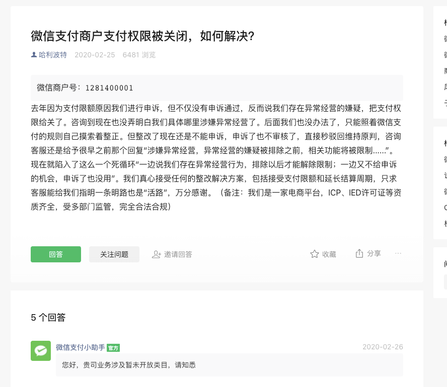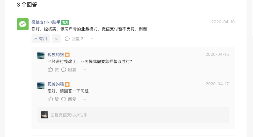 商户看到了和没说一样,解决不了问题,就算是商户使用了不支持的业务模式,请把怎么不支持,商户做了什么,说清楚,或者留个联系方式,沟通清楚,否则真的让商户心寒,我作为微信支付的工作人员都看不下去