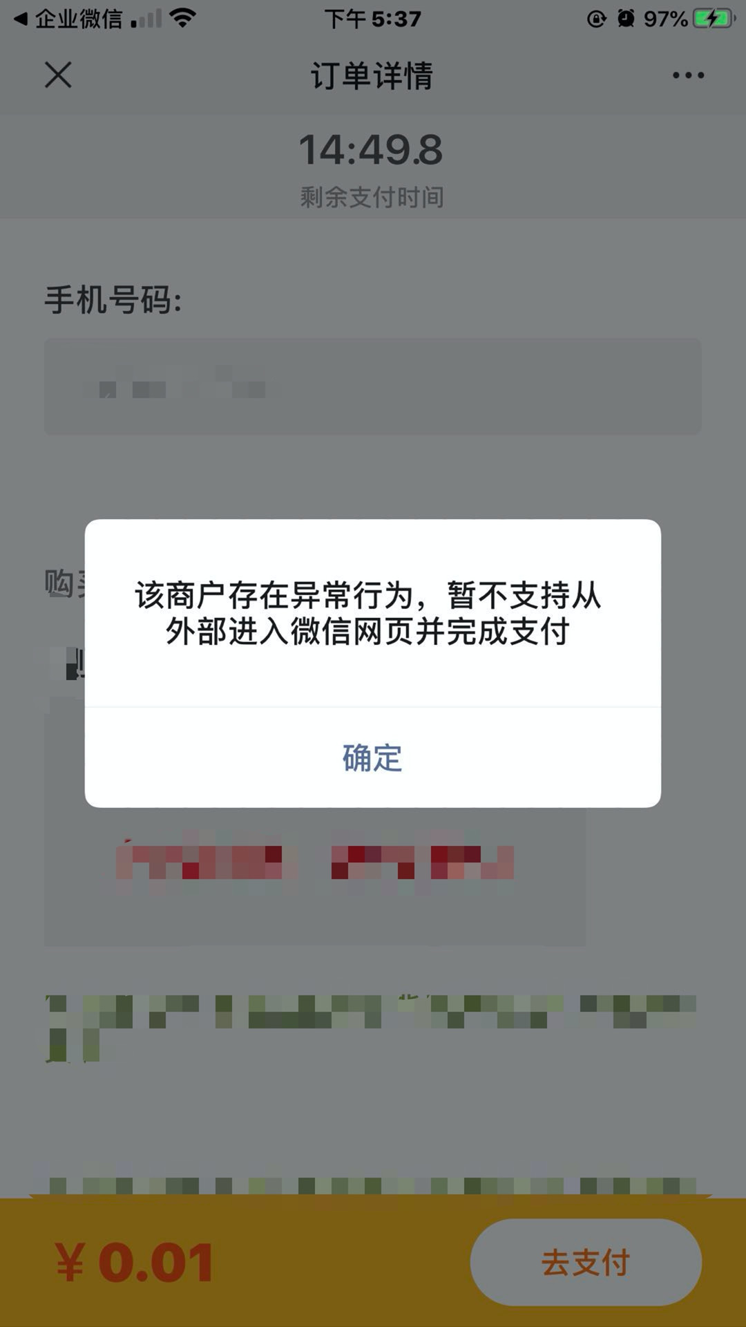 浮现路径:在企业微信中打开服务号的链接,跳转到微信,并唤醒微信支付,支付失败