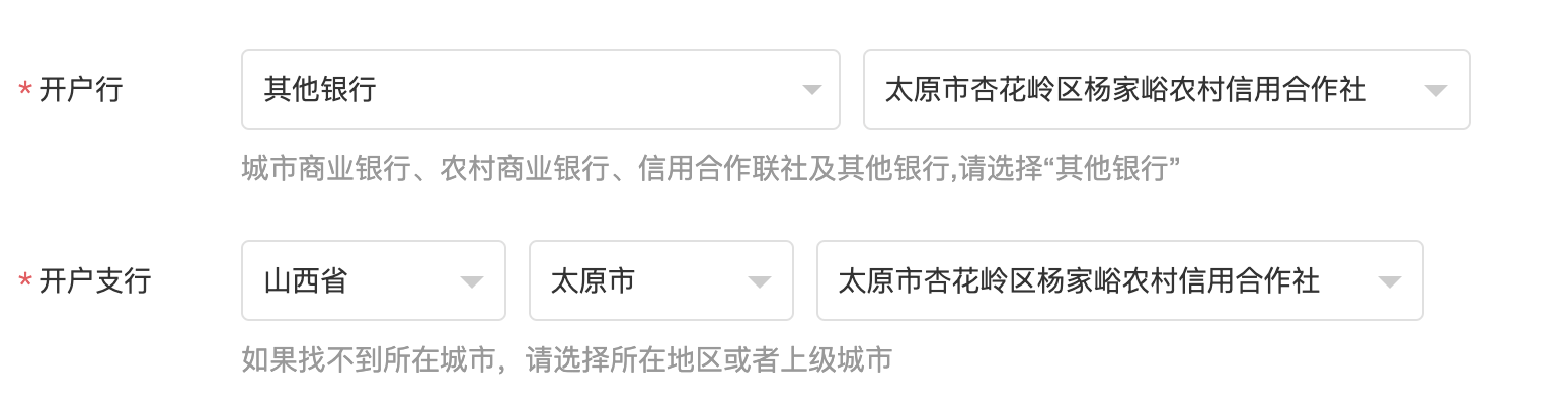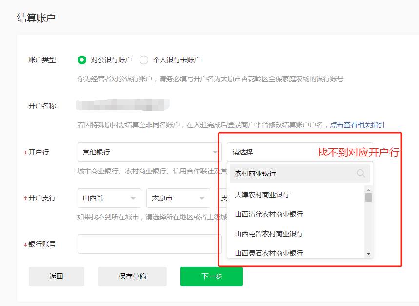 公户的开户银行为:太原农村商业银行股份有限公司杏花岭区支行,在结算账户找不到对应的开户行,请问这个应该怎么填写?