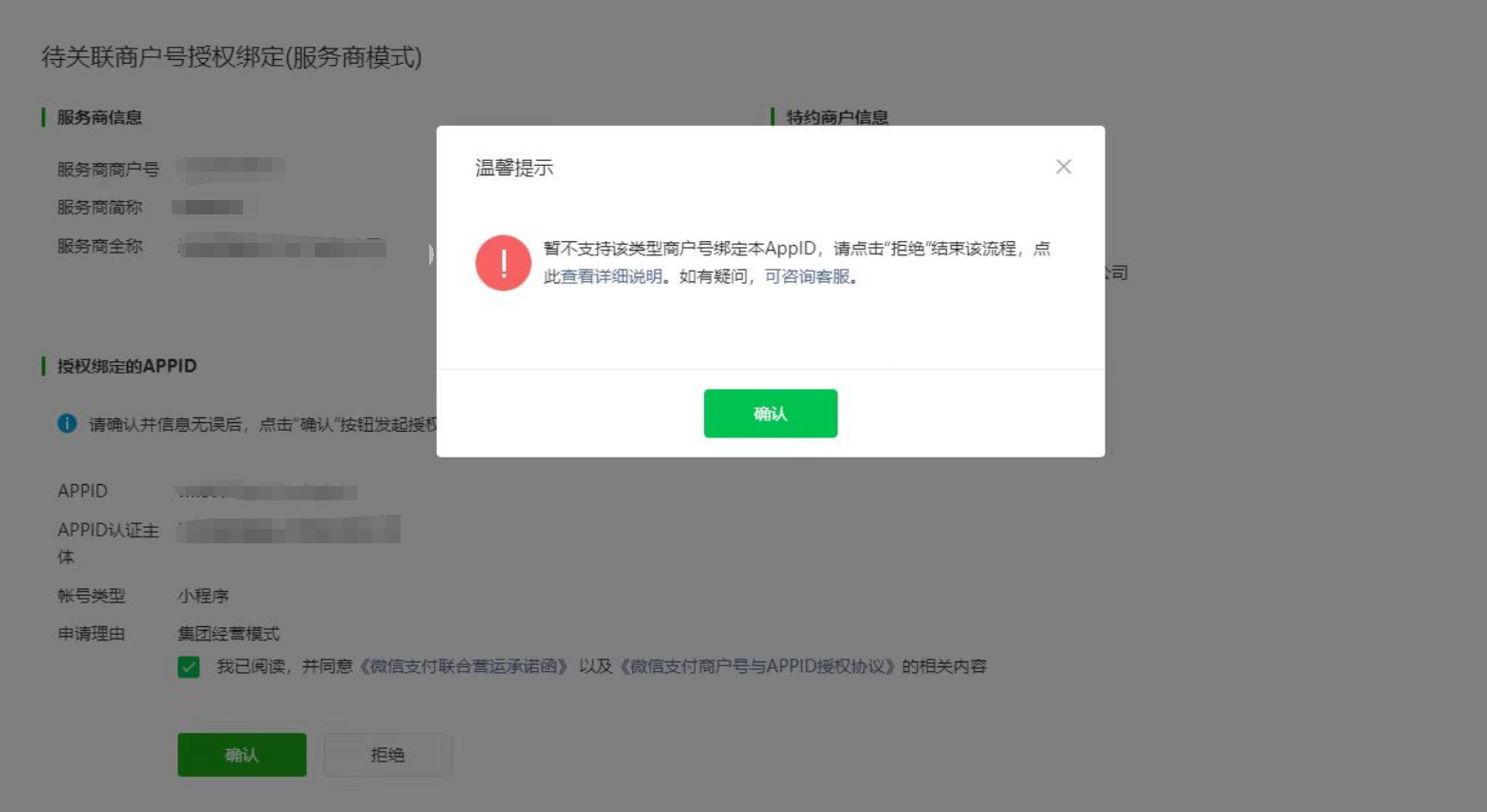 微信支付服务商绑定特约商户时出现如图提醒,查看给的文档,让【完成交易结算管理授权确认】,其中说要接入【订单发货管理】。但是接入发货管理时,又提示没有权限调用,查看相关文档,又说要先进行【交易结算管理确认授权】。这两者相矛盾:没有经过绑定成功、确认授权,就不能接发货管理;绑定的时候也没明确说不支持了,给的相关链接又提到接入发货管理。